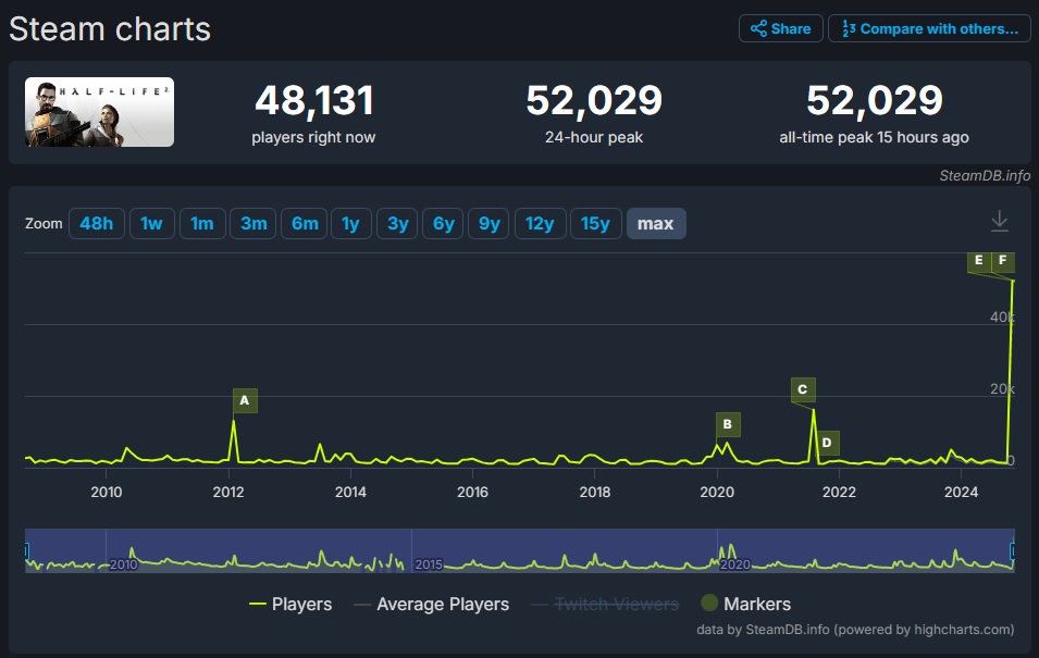 البته انتشار اصلی Half-Life 2 در سال ۲۰۰۵ و Orange Box در سال ۲۰۰۷ ثبت نشدهاند، اما همچنان این آمار برای یک بازی تکنفره ۲۰ ساله بسیار چشمگیر است. نوستالژی خالص و هیجان از انتشار مستند ۲ ساعته سالگرد Valve قطعاً از عوامل مهم این بازگشت هستند، اما احتمالاً بهروزرسانی جدید و قدرتمند ولو برای Half-Life 2 نیز نقش مهمی در این امر دارد.