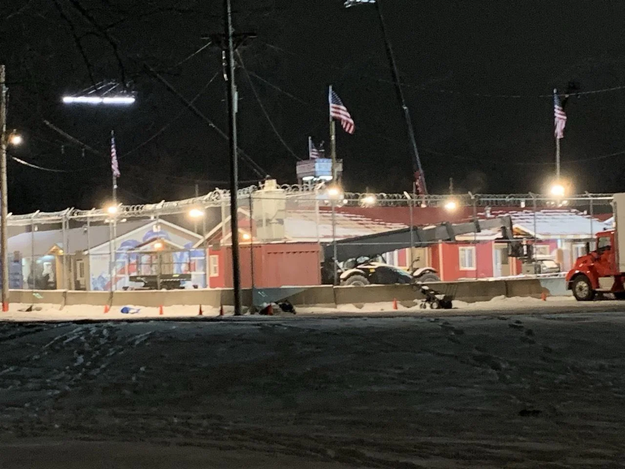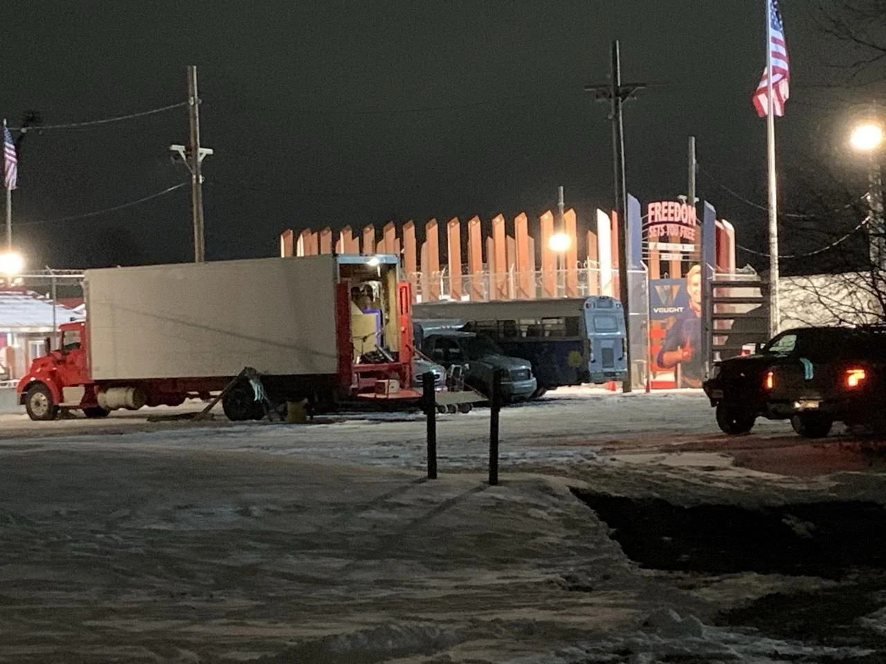 نشانهای به نمایش درآمده، تحت عنوان Freedom Camp 47 با طرح رنگی قرمز، آبی و سفید، شبیه به پرچم آمریکا و لباس هوملندر هستند. همچنین، جرثقیلها و تجهیزات بزرگ دیگری نیز در داخل حصارها مشاهده میشوند که احتمالاً برای فیلمبرداری و اجرای بدلکاری مورد استفاده قرار میگیرند.