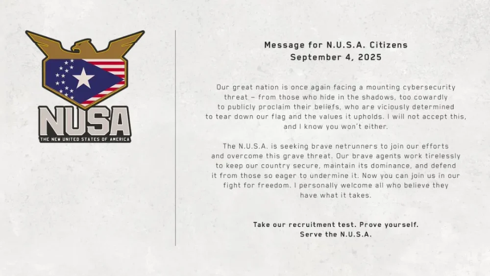 این پیام که در قالب اطلاعیهای از سوی دولت خیالی N.U.S.A. (ایالات متحده جدید) منتشر شده، به تاریخ ۱۳ شهریور ۱۴۰۴ (۴ سپتامبر ۲۰۲۵) اشاره دارد و از تهدیدی جدی در حوزه امنیت سایبری خبر میدهد. در متن پیام، رئیسجمهور روزالین مایرز از Netrunnerها دعوت کرده تا در برابر این خطر واکنش نشان دهند.