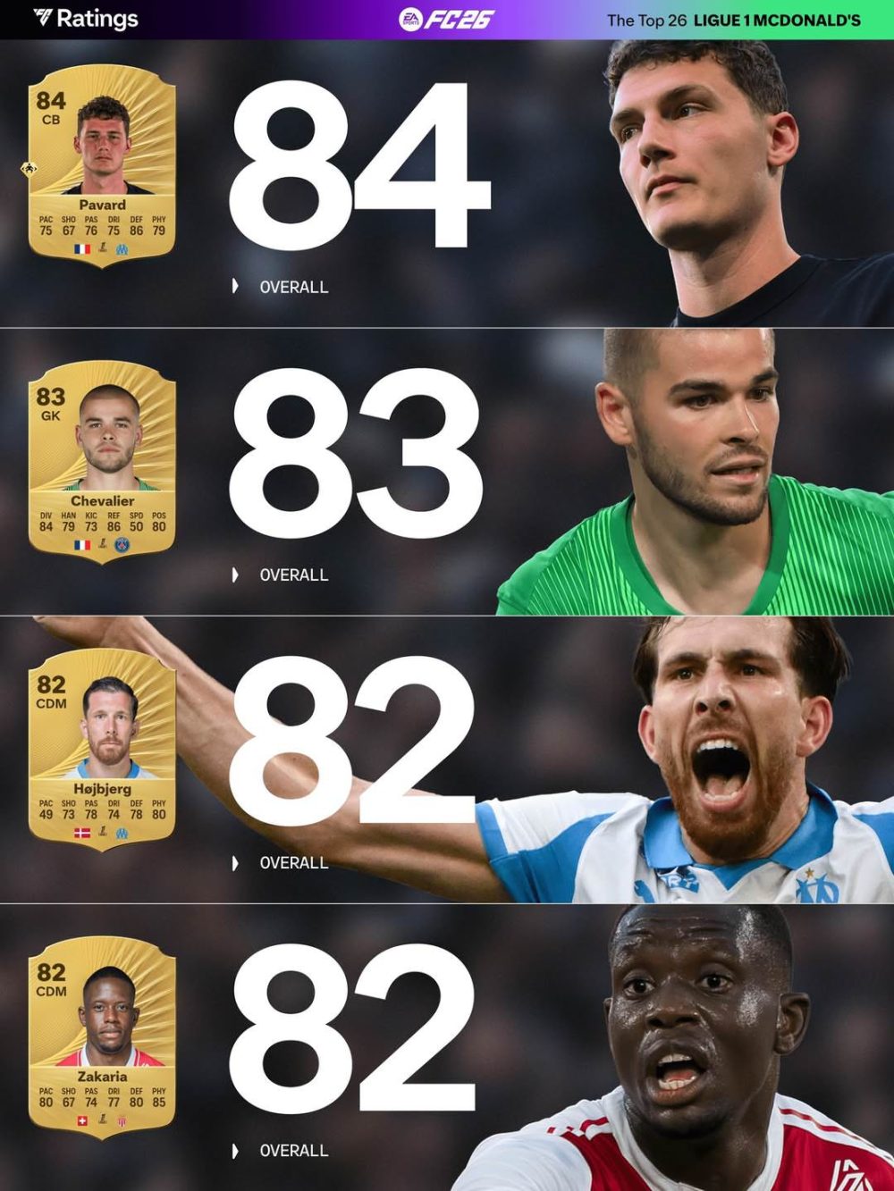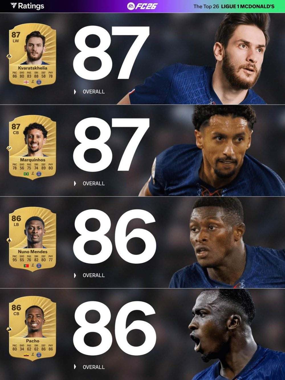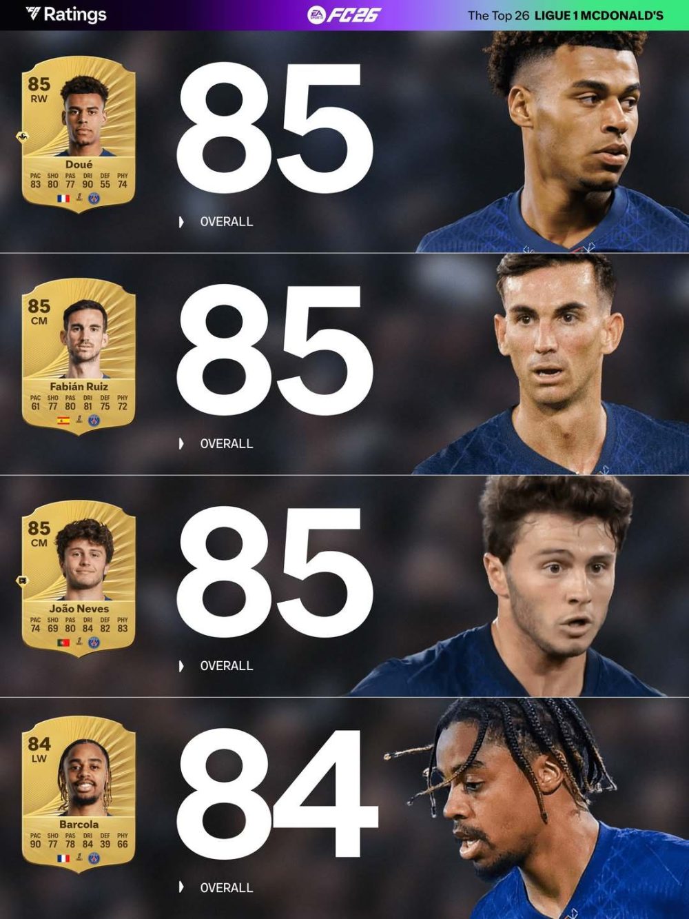 با نزدیک شدن به زمان عرضه بازی EA Sports FC 26، شرکت الکترونیک آرتز فهرست رسمی بهترین بازیکنان لیگ ۱ فرانسه را منتشر کرده، فهرستی که نشان میدهد تیم پاری سنژرمن همچنان بیرقیب در صدر ایستاده است.