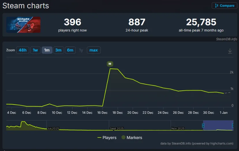 استودیو برای نجات پروژه تصمیم گرفت نسخهای بازطراحیشده با نام Splitgate Arena Reloaded منتشر کند؛ نسخهای که قرار بود آغاز دوبارهای برای بازی باشد. در روزهای ابتدایی انتشار، موجی از کنجکاوی میان بازیکنان ایجاد شد و تعداد قابل توجهی از کاربران به تجربه نسخه جدید پرداختند. اما این توجه اولیه دوام چندانی نداشت و آمار بازیکنان به سرعت کاهش یافت. دادههای موجود نشان میدهد که بازی در برخی پلتفرمها تنها چند صد بازیکن همزمان دارد؛ رقمی که برای یک شوتر رقابتی آنلاین به معنای نبود آینده پایدار است.